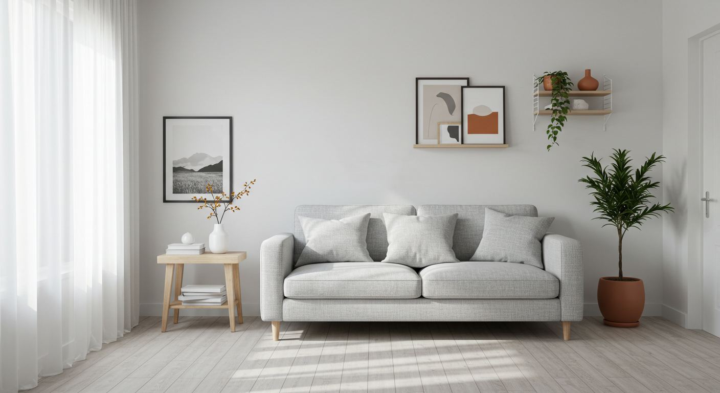- 60%: 화이트 벽 + 라이트 그레이 소파