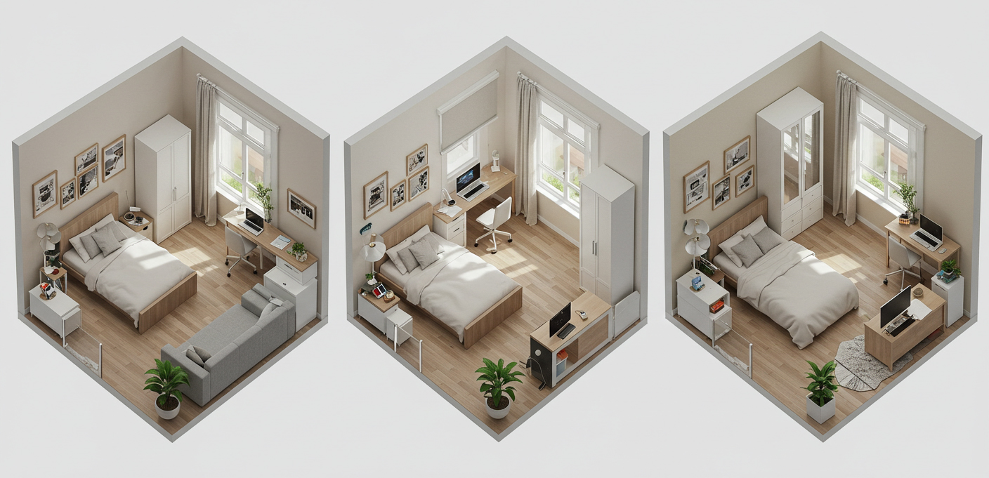 20㎡ 원룸 가구 배치 3가지 레이아웃 제안|침대·책상·수납 최적 포지션 가이드